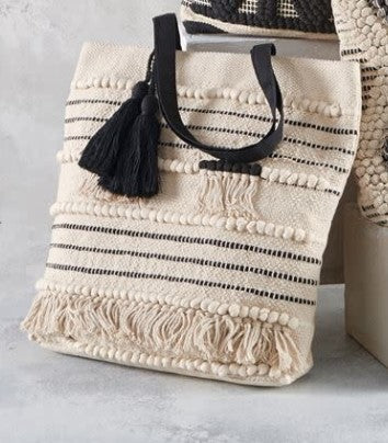 Handloomed tote features washed canvas backing, cotton webbing handles, tassel accent, cotton liner, inner zip pocket and magnetic snap closure.
