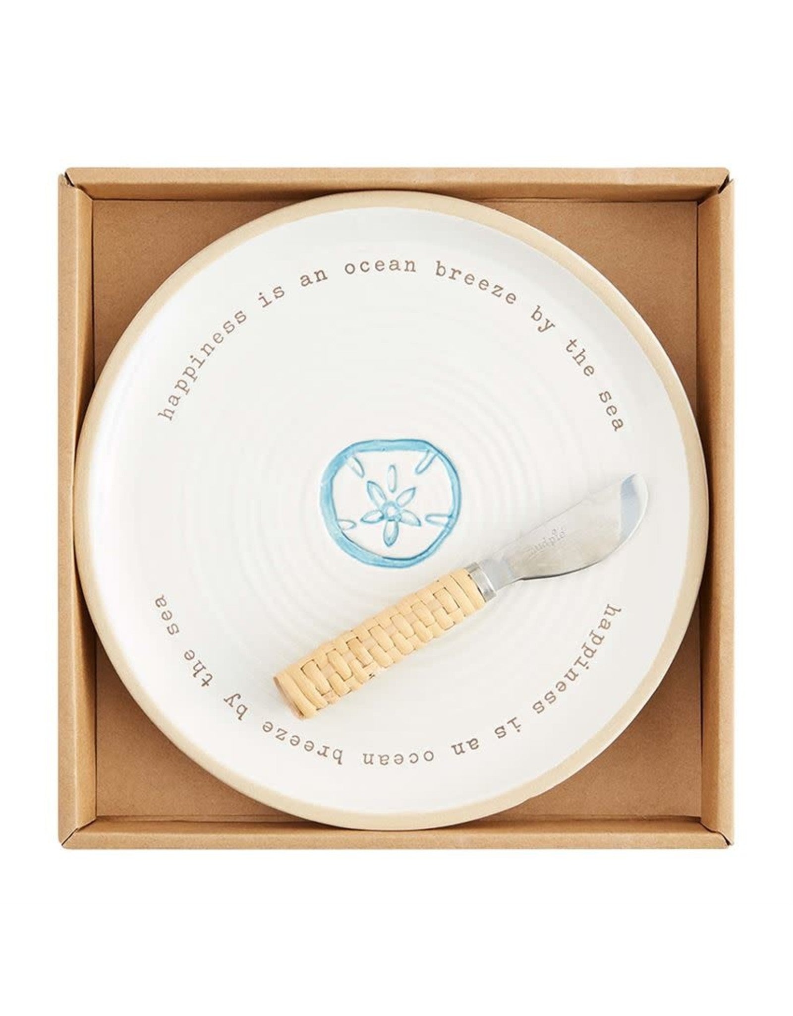 Glazed stoneware cheese plate features hand-painted debossed watercolor sand dollar and sentiment surrounding interior rim.