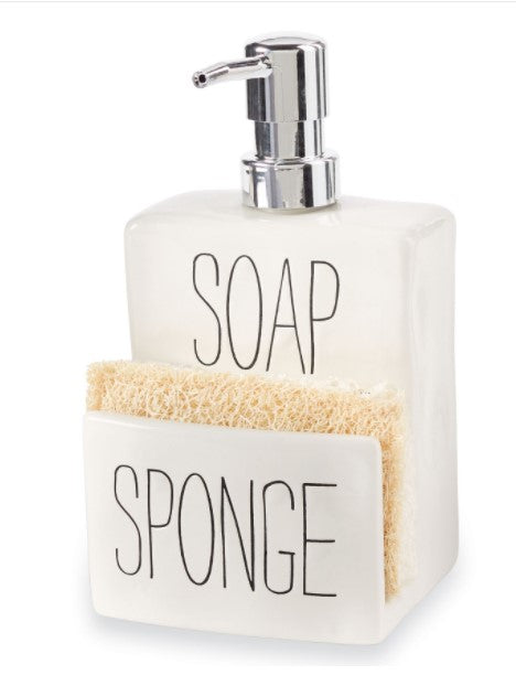 Go ahead and do a double take! This mottled ceramic soap dispenser has a clever space designed for a sponge! Featuring a dispenser with metal pump, chrome finish and debossed SOAP sentiment exterior, this piece comes complete with an attached cubby for SPONGE storage.