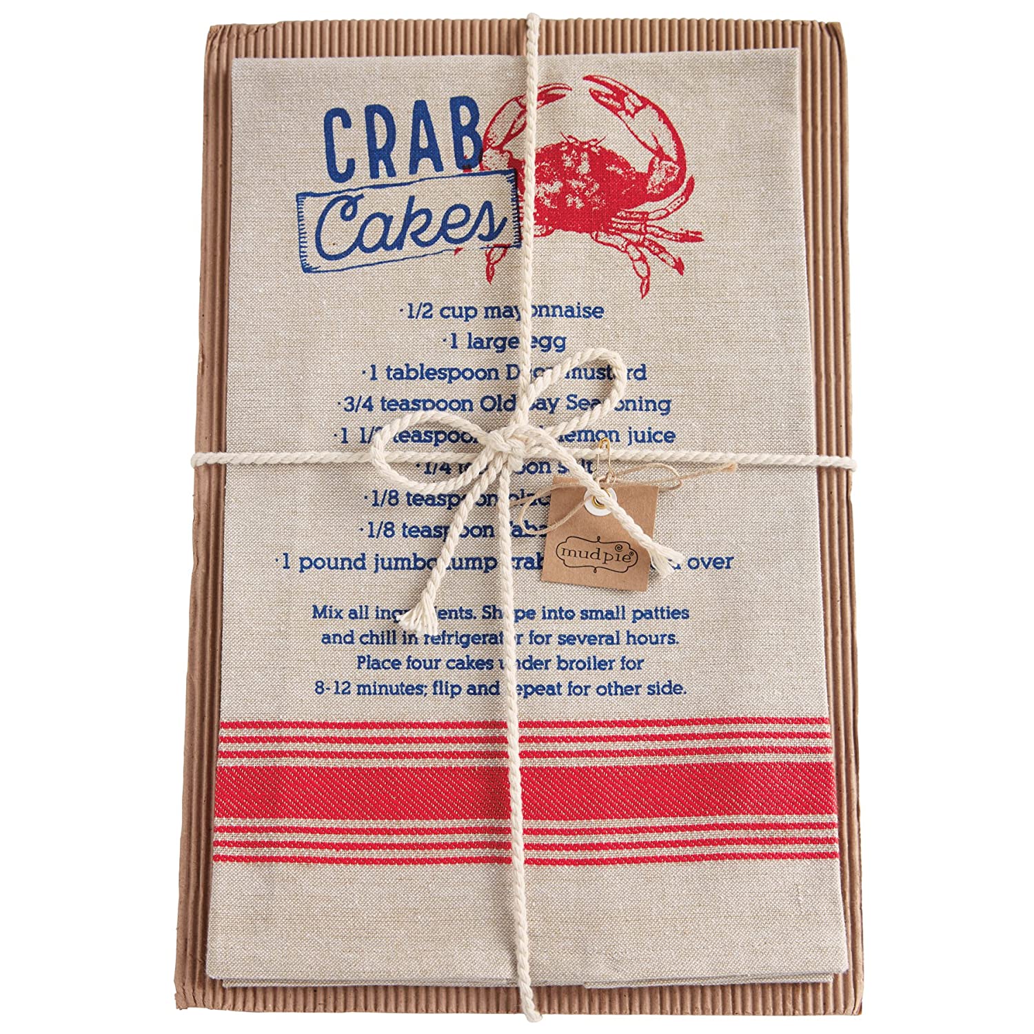 Size: 26x16.5 inches. Printed chambray towels feature authentic crab recipe and coordinating crab icon.