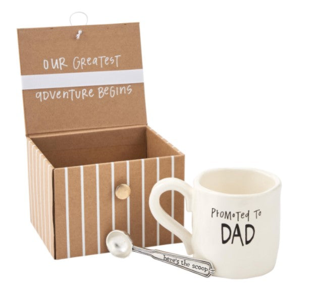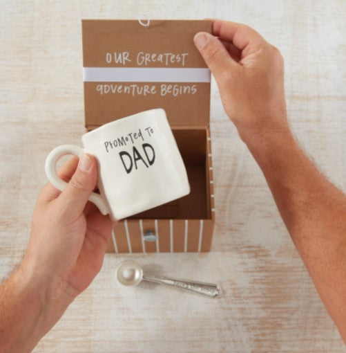 Surprise the Dad-to-be with this Coffee Dad Pregnancy announcement. The debossed ceramic mug arrives in printed paper wrapped gift box. The box reads "Our greatest adventure begins". The mug reads "Promoted to Dad'. The gift box comes with stamped silverplate coffee scoop that reads "here's the scoop".