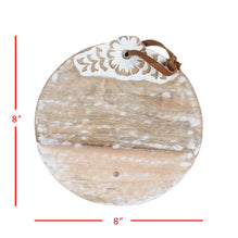 Part of Foreside Home & Garden's hand-carved kitchen collection crafted with eco-friendly mango wood, this small round board is perfect for all your preparing and serving needs. The natural mango wood grain allows this cutting board to sit seamlessly with your other kitchen accessories. The quality craftsmanship that is hand carved into the whimsical floral design across the top and washed in white will make you want to keep these out as a traditional kitchen accent when not in use.