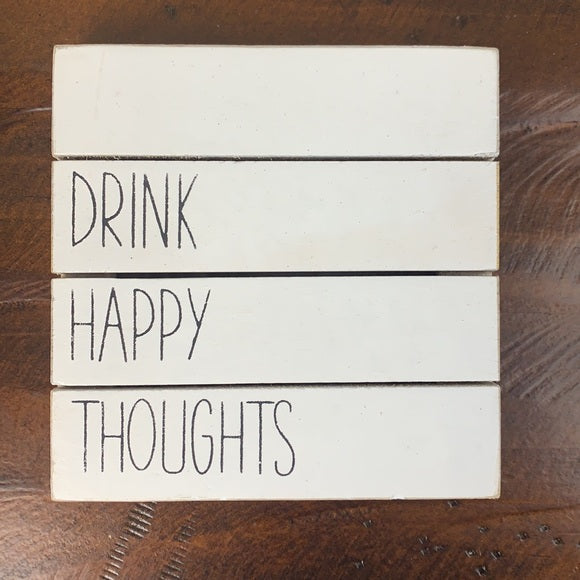 Set of 4 -  4” Square wooden coasters shaped like mini pallets.  All 4 feature the same "Drink Happy Thoughts" sentiment.  Gray lettering on whitewashed pine wood.