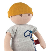Kye is an organic baby soft doll toy and is one of our bestsellers. He has a grey baby grow on with dinosaur embroidery. Kye baby boy doll has a mustard yellow hat on to really set off the outfit.