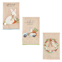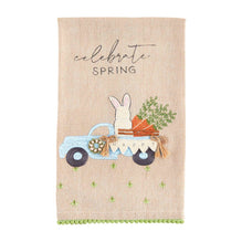 We're so happy it's Spring and time for our Celebrate Spring Hand Towel. The appliqued cotton hand towel features a pom-pom trim. The hand towel features an image of a bunny in a truck, complete with carrots and a banner that reads "Happy". The towel reads "celebrate spring".