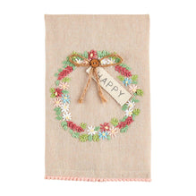 We're so happy it's Spring and time for our Happy Wreath Hand Towel. The appliqued cotton hand towel features a pom-pom trim. The hand towel features a detailed wreath. The wreath features green, blue, white and pink flowers. The hand towel features a sentiment tag that reads "Happy".