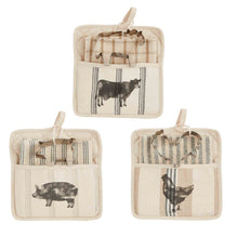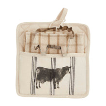 Take your dishes from farm to the table with this Cow Pot Holder and Towel Set. The three piece set comes with a cotton pot holder. The pot holder features a cow image. The pot holder also comes with a cotton hand towel. The set also comes with a cow metal cookie cutter.