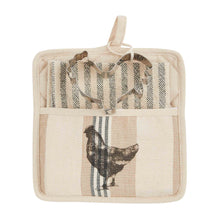 Take your dishes from farm to the table with this Rooster Pot Holder and Towel Set. The three piece set comes with a cotton pot holder. The pot holder features a rooster image. The pot holder also comes with a cotton hand towel. The set also comes with a rooster metal cookie cutter.