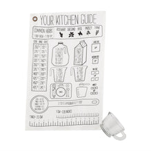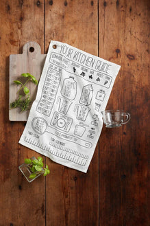 This kitchen measurements towel set is great for college students or new homeowners. The two piece set comes with a glass two cup measuring cup with cup measurements. The measuring cup arrives with printed cotton measuring guide towel that features common kitchen guides like conversions for temperature and measurements.