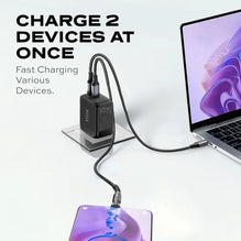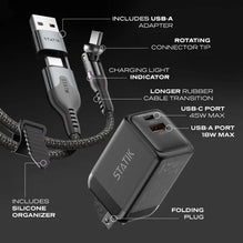 The PowerPivot Pro Cable and Dual 45W Adapter bundle offers a 2-meter USB-C cable with a USB-A adapter and a dual-port 45W adapter, providing quick charging and clutter-free organization for ultimate daily productivity.