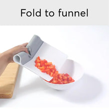 It folds to hold food securely and the fold in the middle lets you funnel food into small bowls infinitely better than using a knife to try to corral carrots and scrape food off of a cutting board into a small bowl.  You'll wonder how you lived without it.